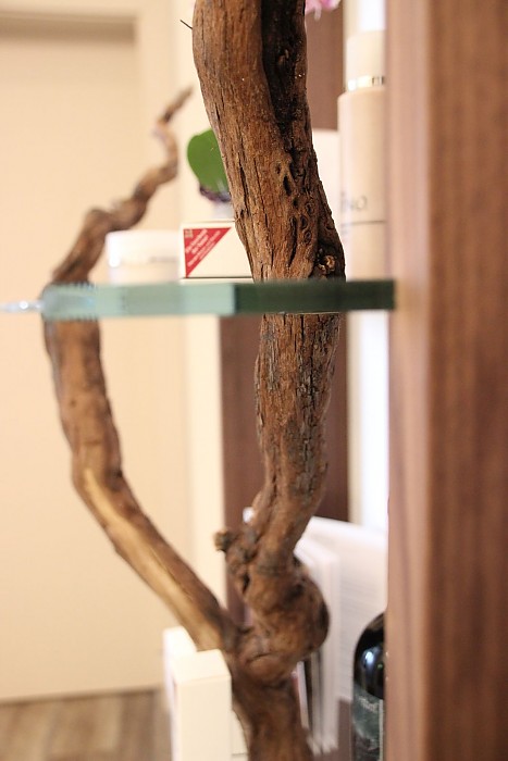 Aussteller aus Holz, Glas und RebeSteher: einheimisches Nussholz Fächer: temperiertes Sicherheitsglas Deko-Element: einheimische Rebe Preis auf Anfrage